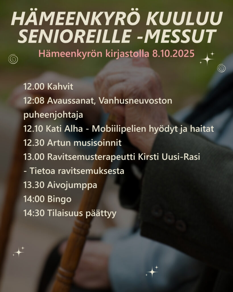 Tervetuloa Hämeenkyrö kuuluu senioreille messulle keskiviikkona 8.10.2025. klo 12.00 -14.30 Hämeenkyrön kirjastolle. Ohjelmaa on koko tapahtuman ajan.