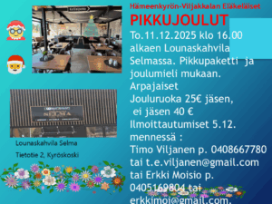 Hämeenkyrön-Viljakkalan EläkeläisetPIKKUJOULUTTo.11.12.2025 klo 16.00 alkaen Lounaskahvila Selmassa.