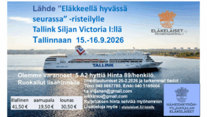 Tallinnan hotellimatka 26-27.8.2025 hotelli Nordic ForumMatkan hinta 200 € , sisältää : bussikuljetuksen (Lamminmäki) -laivamatkat-hotellinja hotellissa aamiaisen.Paikkoja tilattu 100:lle hengelle.Ilmoittautuessa peritään 100€ :n etumaksu.ILMOITTAUTUMISET 10.6.2025 MENNESSÄ ELISALLEMATKA TULEE OLLA KOKONAISUUDESSAAN MAKSETTU 15.7.2025ALUEJÄRJESTÖN TILILLE.Matkavastaavat keräävät porukkansa ja ilmoittavat erillisellä kaavakkeella(toimitetaan myöhemmin) syntymäaika ilmoitetaan esim.13.7.1949 ei loppuosaa.Katajanokalla pitää olla klo 9.30 bussi mukana koko matkanLähtöaika:Bussi n:ro 1 Kyröskoski Matkahuolto klo 6.15Ylöjärvi Matkatie ” 6.40Nokia linjaautoasema ” 7.00Bussi n:ro 2 Tampere Vanhakirkko klo 6.20Lempäälä S-Market ” 6.50Viiala Akaa Areena ” 7.05Valkeakoski linjaautoasema ” 7.30